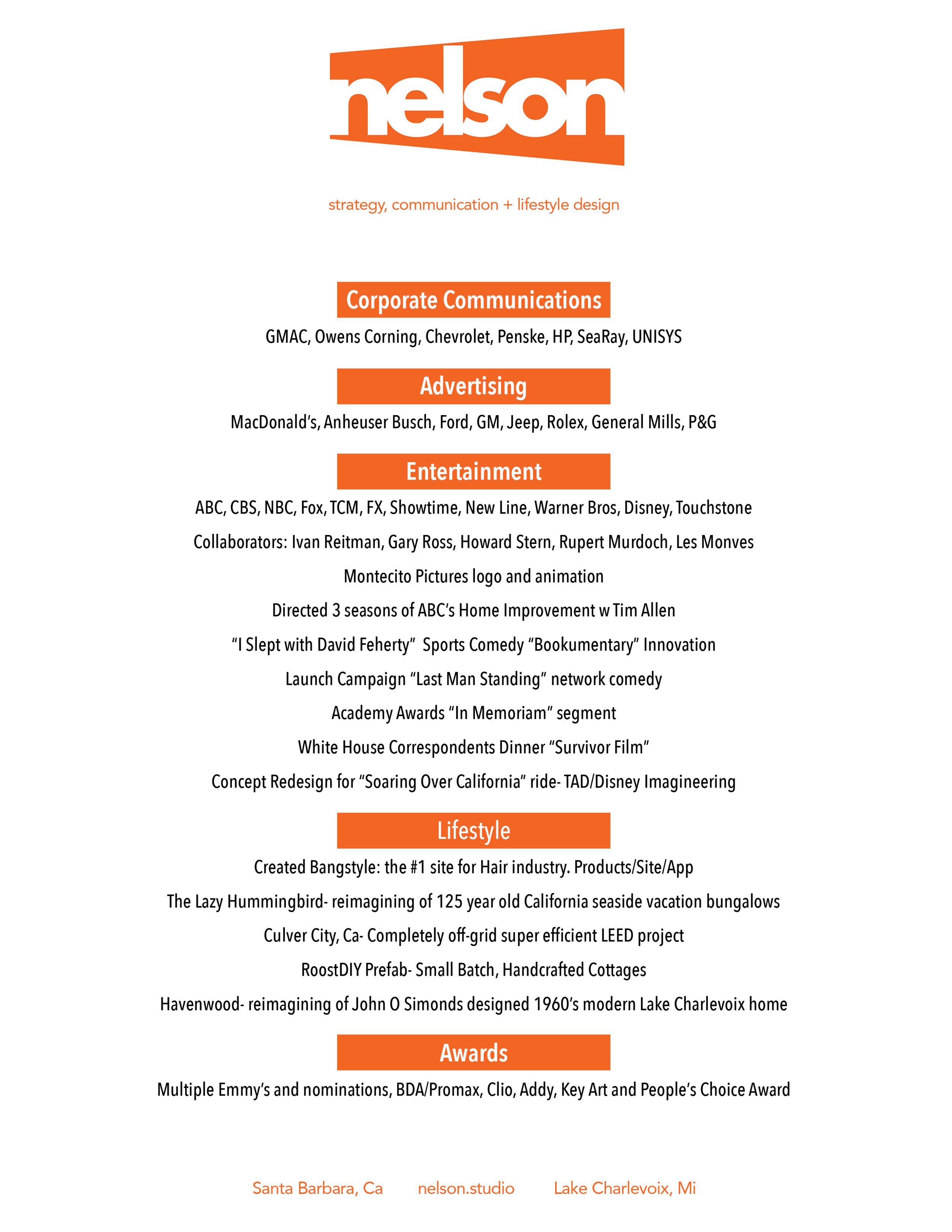 After several whirlwind decades as an award winning Director, Designer and Creative Director, Nelson reached the pinnacle in 5 different arenas: Commercial Advertising, Broadcast Promotions, Network Television (directed the number one sitcom for 3 years) Movie Advertising and created and sold a culture site w 1 million monthly visitors.